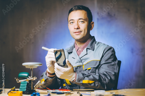 fix, repair, contraption, mobile, mobile phone, phone, phone, smartphone, specialist, device, professional, repairman, service, electrician, craftsman, fixing, help, technician, men at work, instrument, shop, master, male, photogenic, man, person, engineer, expert, guarantee, processing