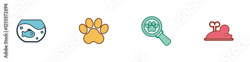 Set Aquarium with fish, Paw print, Veterinary clinic and Clockwork mouse icon. Vector
