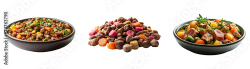 Set, collection of Dog food with meat and vegetables isolated on transparent background.