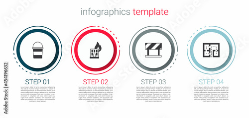 Set Fire bucket, in burning building, Road barrier and Evacuation plan. Business infographic template. Vector