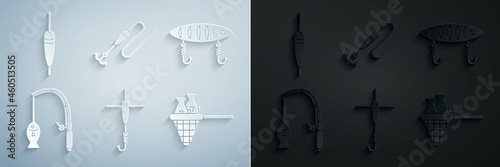 line, hook, float, fish, vector, icon, illustration, bait, fishing, lure, isolated, set, paper, cut, origami, three-dimensional, volumetric, white, black, spoon, catch, equipment, hobby, sport, rod, spinning, reel, symbol, tackle, background, object, signs, net, netting, trap, tool, accessory, catcher, fishing net, handle, water, leisure, design, river, fisherman