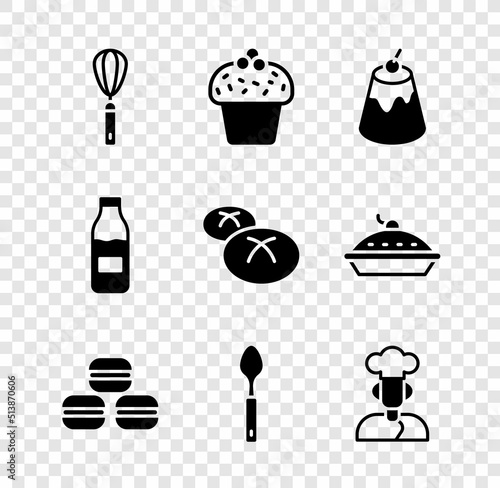 Set Kitchen whisk, Cake, Pudding custard, Macaron cookie, Spoon, Cook, Bottle with milk and Bread loaf icon. Vector