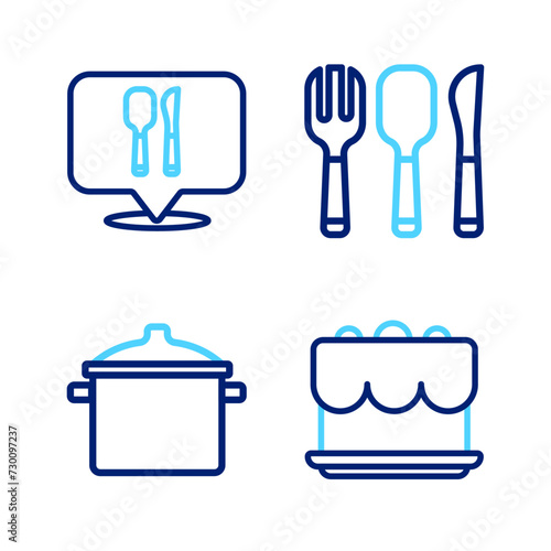 Set line Cake, Cooking pot, Fork, spoon and knife and Cafe restaurant location icon. Vector
