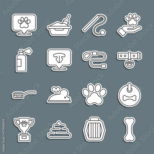 Set line Dog bone, collar, Collar with name tag, Pet cat toy, Cat nose, shampoo, Location veterinary hospital and Retractable cord leash icon. Vector