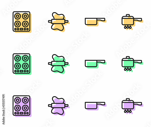 Set line Frying pan, Gas stove, Rolling pin on dough and Cooking pot fire icon. Vector