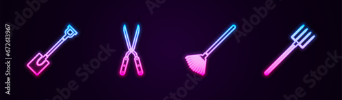 Set line Garden shovel, Gardening handmade scissor, rake for leaves and pitchfork. Glowing neon icon. Vector