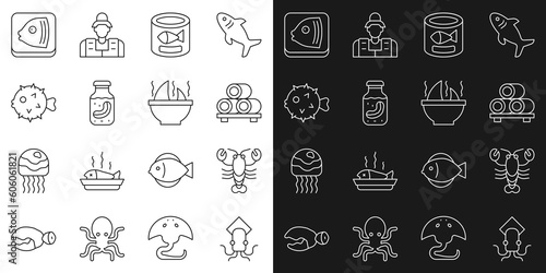 Set line Octopus, Lobster, Sushi on cutting board, Canned fish, Sea cucumber jar, Fish hedgehog, head and Shark fin soup icon. Vector