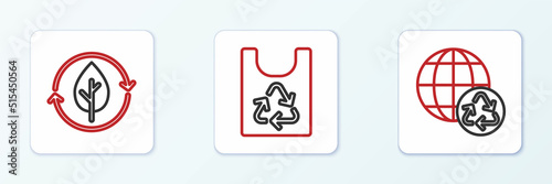 Set line Planet earth and recycling, Recycle leaf and Plastic bag with recycle icon. Vector