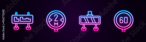 Set line Road traffic sign, , barrier and Speed limit. Glowing neon icon. Vector