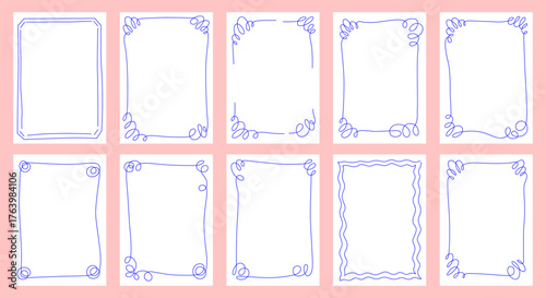 Set of 10 decorative frames, hand drawn with blue pen and fine marker on blank white sheet of A4 vertical paper. Vector template in form of sketch for text, gallery of pictures.