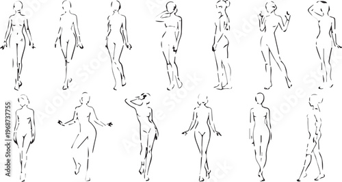 figure, drawing, pose, female, woman, body, vignetting, art, human, anatomy, model, standing, walking, gesture, line, illustration, vector, design, graphic, outline, silhouette, character, study, practice, artist, education, reference, template, collection, set, people, person, adult, youth, slim, thin, elegant