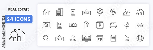 Set of 24 Real Estate web icons in line style. Rent, building, agent, house, auction, realtor. Vector illustration.