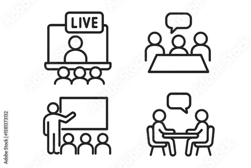 meeting, conference, business, classroom, presentation, teamwork, interview, communication, online, learning, discussion, seminar, workshop, education, training, lecture, speech, speaker, audience, team, group, collaboration, talk, panel, corporate, digital, remote, virtual, outline, icon, line, symbol, web, mobile, app, interface, people, conversation, dialogue, teaching, coaching, briefing, consulting, illustration, modern, minimal