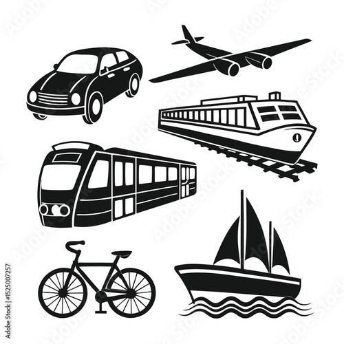 transportation, icon, vector, set, car, automobile, vehicle, aeroplane, plane, train, tram, bicycle, bike, sailboat, boat, travel, commute, transport, symbol, signs, illustration, graphic, design, element, web, digital, marketing, presentation, background, black, white, minimalist, modern, simple, flat, clip art, graphic, optical
