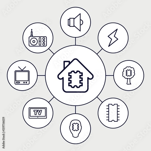 electrical, icon, radio, television, central processing unit, lamp, flash, in, house, tree, head, outline, set, vector, illustration, design, symbol, technology, isolated, graphic, background, electronic, computer, abstract, signs, flat, style, board, chips, digital, electric, circuit, processor, network, entertainment, web, hardware, microchip, object, media