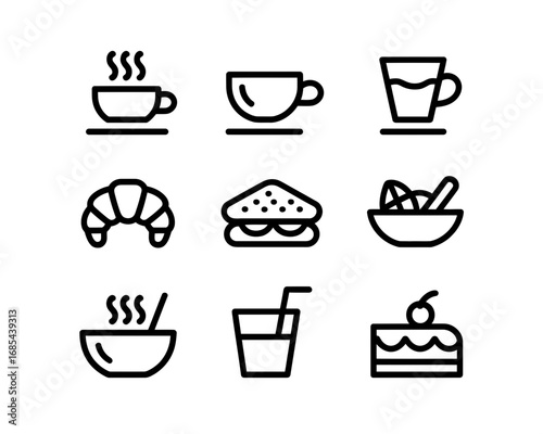 vector, illustration, scalable, icon, set, minimalist, line, art, food, drink, hot drink, tea, croissant, sandwich, salad, soup, juice, cake, breakfast, meal, refreshment, graphic, design, symbol, outline, black, and, white, isolated, clip art, modern, simple
