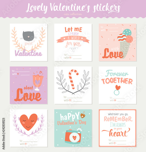 Set of 9 square Valentines day gift tags, stickers and labels templates. Romantic and beauty posters set. Lovely card for Valentine's day, wedding, marriage, save the date, bridal. Vector illustration