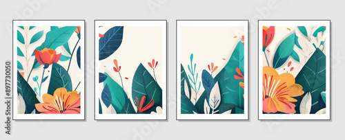 set of abstract vector backgrounds featuring tropical leaves. Hand-drawn textures suitable for wall decoration, postcard designs, or brochure covers.
