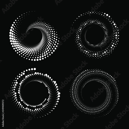 Set of abstract white dotted stripes. Spiral form. Halftone dots. Trendy design element for frame, logo, tattoo, sign, symbol, web, prints, posters, template, pattern and abstract background