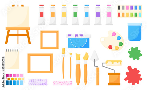 brush, paint, supply, artistic, art, education, creativity, canvas, school, paintbrush, stationery, painter, painting, coloured, doodle, hobby, tool, preschool, idea, kindergarten, spray, watercolor, children, childhood, acrylic, artist, craft, picture, creation, create, artwork, vector, illustration, icon, palette, equipment, ink, cartoon, collection, design