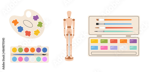 artist, palette, set, school, wooden, mannequin, hobby, paint, sticker, brush, creation, art, creativity, day, drawing, hand, drawn, element, flat, icon, illustration, isolated, cognition, product, style, tool, vector, watercolor, earth