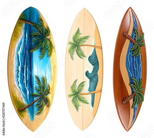 surfboard, wooden, beach, ocean, wave, tropical, summer, water sport, adventure, design, surf, sea, nature, vacation, travel, coastal, lifestyle, decorative, palm tree, blue water, sport, wood texture, aesthetic, handcraft, artistic, active, holiday, paradise, relaxation, trendy, stylish, hawaiian, nautical, set