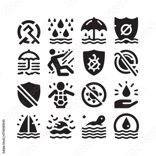 Set of black and white icons illustrating water resistance, protection, and environmental themes Keywords: water, protection, shield, umbrella, rain, drops, waves, sea, ocean, boat, sailboat