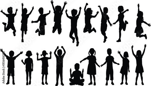 Set of black silhouettes of children jumping, playing, and raising hands isolated on white background for youth, happiness, and school design,