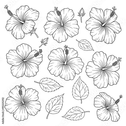 Set of Botanical Hibiscus Sketches for Greeting Card Design