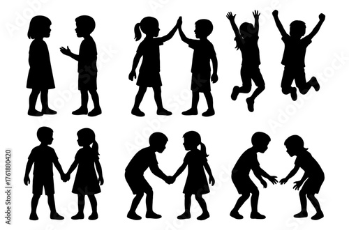 children, silhouette, boy, girl, playing, children, set, friendship, jumping, holding hands, high five, childhood, isolated, vector, interact, friends, happy, fun, collection, joy, talking, black, icon, people, pose, couple, togetherness, active, game, figure, graphic, white background, person, sibling, illustration