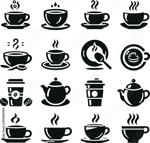 hot drink, cup, tea, vector, mug, drink, cafes, icon, set, illustration, espresso, hot, silhouette, beverage, cappuccino, symbol, design, breakfast, caffeine, steam, mocha, food, saucer, kitchen, signs