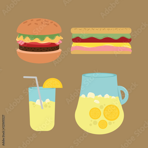 food, cooking, kitchen, burger, sandwich, juice, fresh, cold, drink, cook, plate, preparation, utensil, pot, menu, service, flat, eat, kitchen utensile, vector, illustration, design