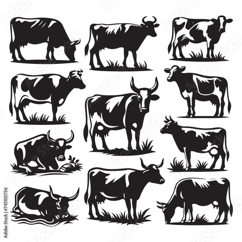 Set of cow silhouettes isolated on a white background, Vector illustration.