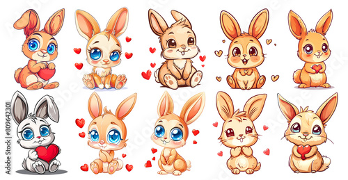 Set of Cute bunny with hearts, cartoon, Clipart Bundle, isolated, png, generated ai