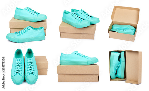 set of different Turquoise rubber sneakers with package, casual footwear isolated on white background