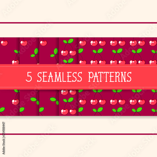 Set Of Five Seamless Patterns For Your Products And Business. Vector Of Cherry