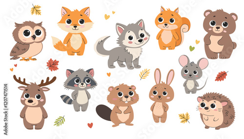 Set of flat vector illustrations. Cute forest animals. Bear, mouse, fox, hedgehog, squirrel, raccoon, beaver, hare, elk, deer, owl. Vector illustration.
