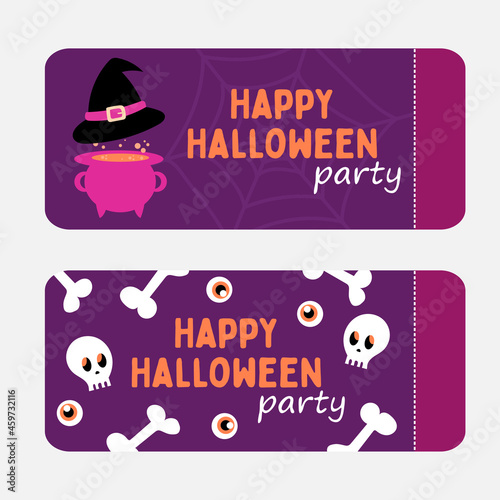 Set of flyers or invitation cards for Halloween party. Cartoon style in purple vibrant colors