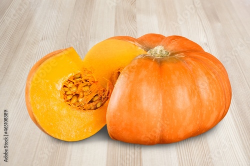 Set of fresh whole and sliced pumpkin on the desk