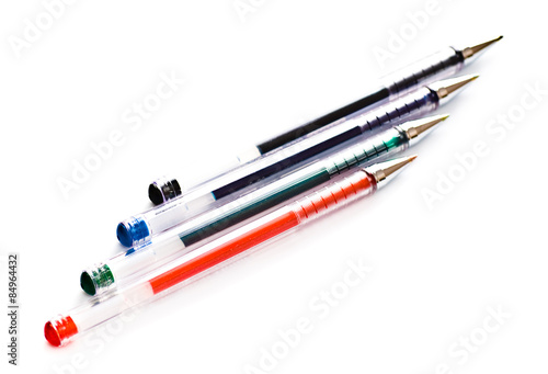 gel, ink, pen, colours, set, coloured, cap, top, top, red, green, blue, black, isolated, white, background, photo, image, closeup, equipment, school, business, office, chancellery, stationery, lay, laying, pen, write, writing, crayons, draw, 4, nobody, secretary, design, plastic, metal, nib, tool, tool, row