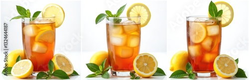 Set of glasses filled iced tea with lemon and mint leaves. Refreshing cold beverage, transparent glassware, ice cubes. Summer drink, citrous slice, fresh thirst quencher. Perfect for summer heat.