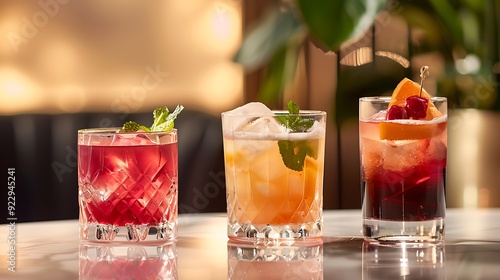 Set of glasses with yummy exotic cocktails on table in luxury restaurant