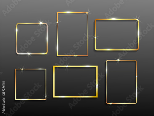 Set of gold shiny glowing vintage frame with shadows. Wedding or Valentines day concept. Xmas and New Year. Golden luxury realistic border. Vector illustration. Isolated on black background.