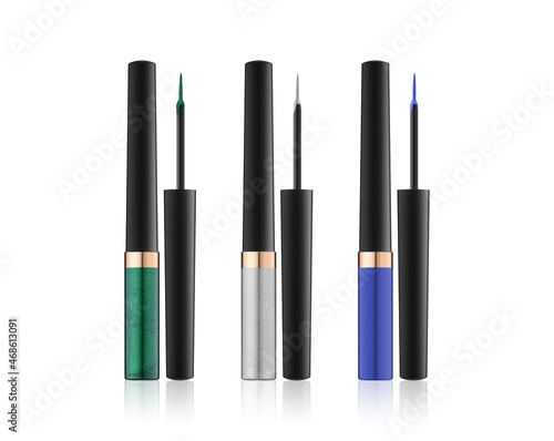 Set of Green and silver texture, and blue Waterproof Eyeliner open and closed. isolated on white background