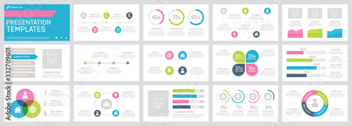 Set of green, blue, dark grey and pink elements for multipurpose presentation template slides with graphs and charts.