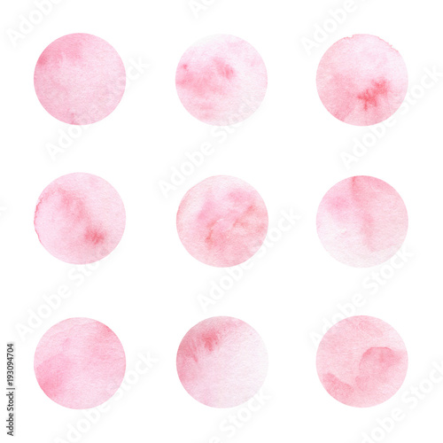 Set of hand painted watercolor circle textures isolated on the white background for your design. Pink dots.