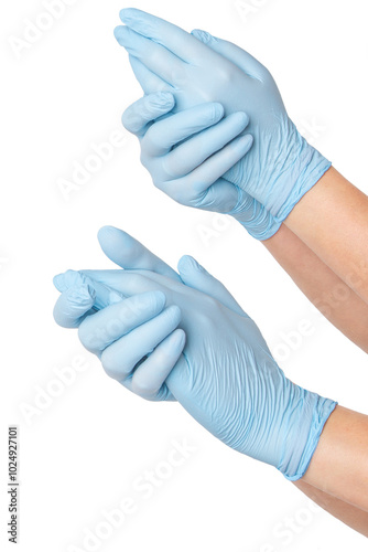 Set of hands in medical gloves clasped together on an empty background. Unity, collaboration, healthcare themes.