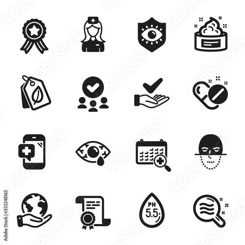 Set of Healthcare icons, such as Hospital nurse, Ph neutral. Certificate, approved group, save planet. Bio tags, Dermatologically tested, Medical phone. Vector