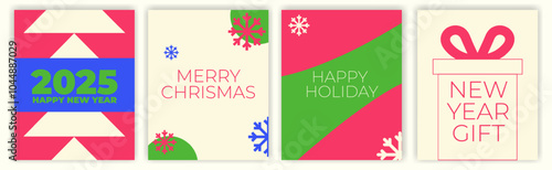 set of holiday card designs Happy New Year 2025, Merry Christmas, and New Year Gift. minimalist style, greetings, background and holiday decor
