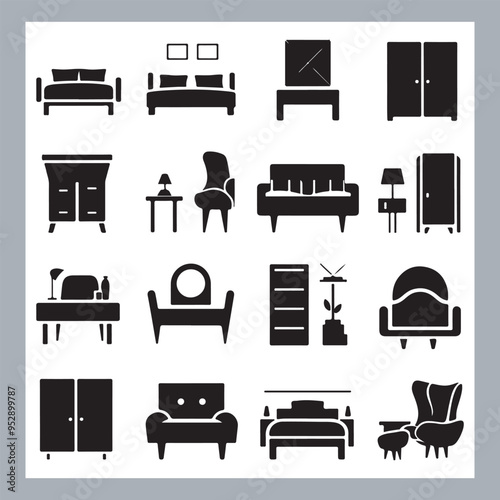 Set of house furniture silhouette Chair, sofa, table, bed, dresser, wardrobe, bookshelf, dining table, armchair, desk, cabinet vector in white background